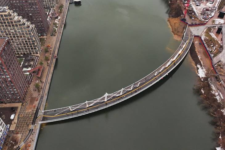 Строительство велопешеходного моста через Нагатинский затон было начато в феврале 2023 г. и завершено в декабре 2024 г. Проект реализован за счёт средств Адресной инвестиционной программы города.